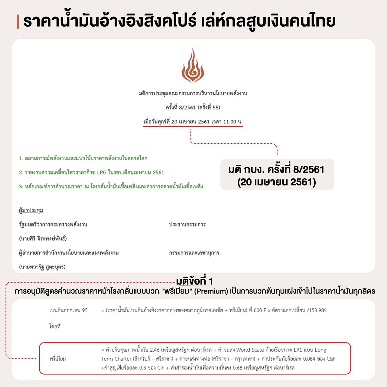 มติข้อที่ 1: การอนุมัติสูตรคำนวณราคาหน้าโรงกลั่นแบบบวก “พรีเมียม” (Premium) เป็นการบวกต้นทุนแฝงเข้าไปในราคาน้ำมันทุกลิตร ประกอบด้วย