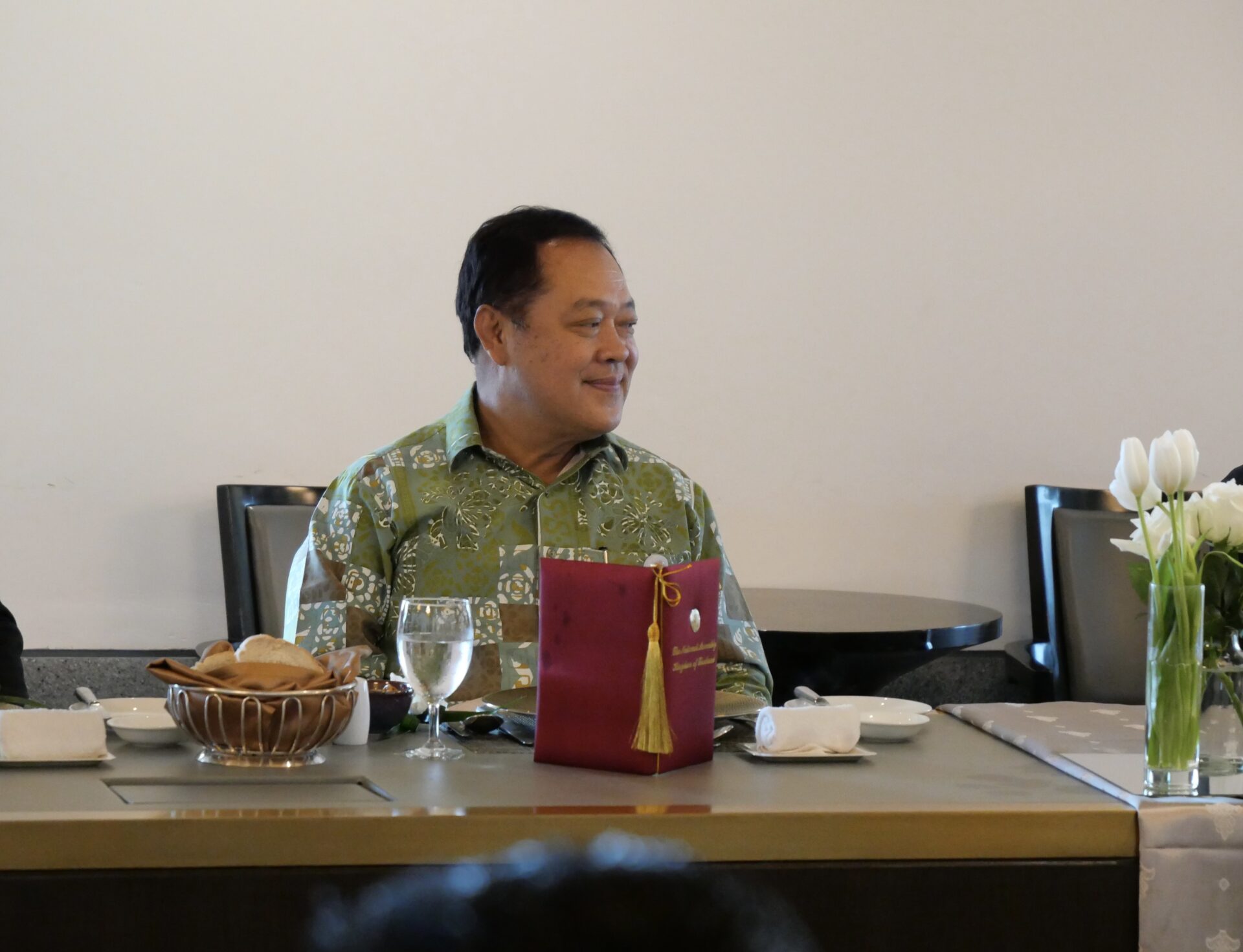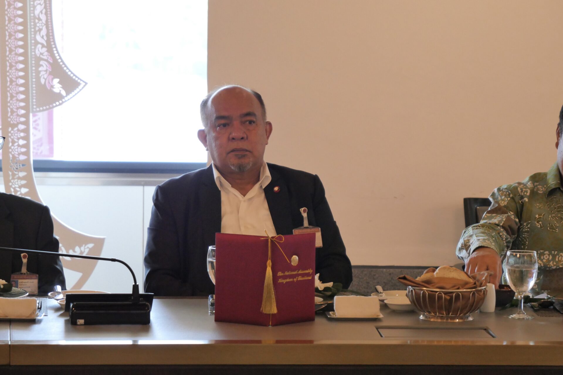 ผู้สื่อข่าวรายงานเพิ่มเติมว่า นายวันมูหะมัดนอร์ มะทา ประธานรัฐสภาและประธานสภาผู้แทนราษฎร ยังได้มอบเสื้อตราสัญลักษณ์รัฐสภาให้กับ คณะผู้บริหารองค์การบริหารส่วนจังหวัดนราธิวาส นำโดย นายกูเซ็ง ยาวอหะซัน นายกองค์การบริหารส่วนจังหวัดนราธิวาส และ กลุ่มของนายธนาธิป พรหมชื่น หรือ กำนันเพื่อน และถ่ายภาพร่วมกันเป็นที่ระลึก ขณะที่ทางคณะฯ มีกำหนดการรับประทานอาหารค่ำที่ ท่าเรือ เอเชียทีค เดอะ ริเวอร์ฟร้อนท์ โดย พันตำรวจเอก ทวี สอดส่อง หัวหน้าพรรคประชาชาติ จะร่วมเดินทางมาด้วย ในเวลา 19.00 น.